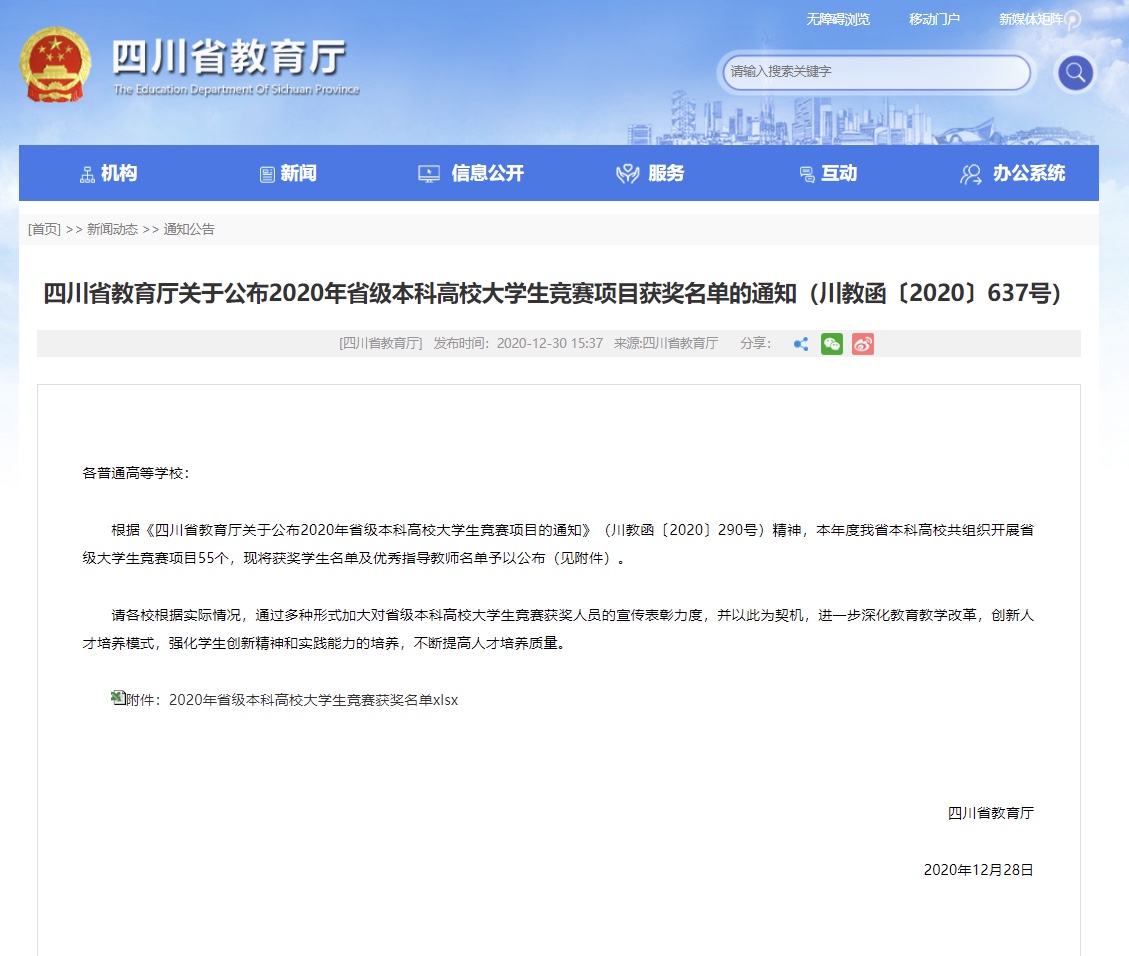 12月31日,2020年四川省老员工原创动漫大赛评审结果在四川省教育厅和四川省本科高校竞赛平台官网上陆续公布,公司员工取得佳绩,获得一等奖1项、二等奖2项、三等奖9项,南京、刘婉毅获得“优秀指导老师”。