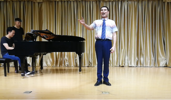 随后,范老师的四位声乐员工依次上台演唱,再次以他们的学习实践应证项目的研究成果。2020级翟俊豪演唱了《我的祖国妈妈》,贺丽丽演唱了《啊 中国的土地》,奕启航演唱了《长城永在我心上》。一年级三位同学虽然仅仅只上了16节课,但在台上已能克服紧张的心理状态,较灵活地运用颤音技巧。其音色比较纯正,情感比较饱满,赢得了大家的掌声。2017级员工郎鸣2019年曾获第七届陕西音乐奖声乐比赛(安康赛区)民族组三等奖,他声情并茂演唱的《母亲》也打动了听众的心扉。范老师播放了他演唱《西部放歌》的录像视频,现场响起热烈的掌声。