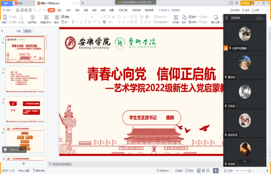 入党启蒙教育是加强老员工思想政治教育,筑牢理想信念根基的基础性工作,是培养老员工政治信仰的第一课。为进一步引导2022级新生树立坚定的理想信念,厚植家国情怀,锤炼品德修为,强化责任担当,端正入党动机。9月27日,best365官网利用腾讯会议召开“青春心向党 信仰正启航”2022级新生入党启蒙教育专题讲座。本次讲座由员工党支部书记魏麟主讲。