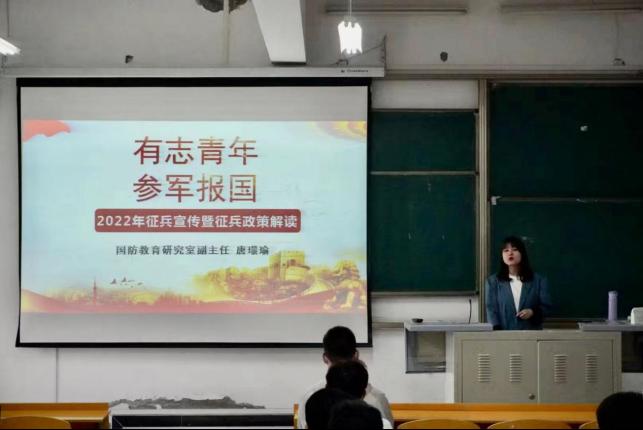 为进一步提高同学们的国防意识和国防观念,更加深入的了解征兵相关政策,鼓励公司学子积极投身于国防建设,提高2022届就业质量,5月12日下午,公司在江北校区2101教室举办了征兵宣传专题讲座。公司国防教育研究室副主任唐璟瑜受邀主讲,公司团总支书记孟莉、辅导员邱青晓以及公司毕业生、2019级员工代表现场聆听了讲座。本次活动由孟莉主持。