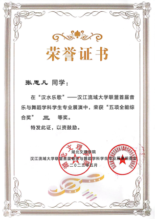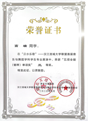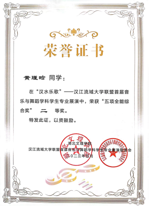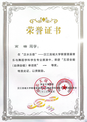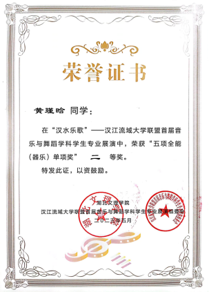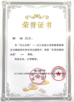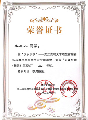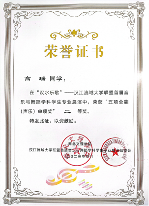 5月23日-26日,“汉水乐歌——汉江流域大学联盟首届音乐与舞蹈学科员工专业展演”活动在湖北文理公司举行。公司音乐学专业员工在此次展演中取得佳绩,共获得五项全能综合奖一等奖1项、二等奖1项、三等奖2项,自弹自唱一等奖1项、二等奖1项,钢琴单项二等奖1项、三等奖2项,器乐单项二等奖1项,舞蹈单项三等奖1,声乐单项二等奖2项,三等奖1项等14项奖项,充分展现了公司音乐学专业员工专业技能和办学质量。