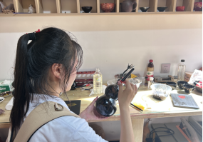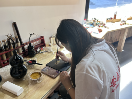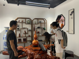 8月30日,实践团队赴陕西龙头国漆文化有限公司开展调研,师生们参观了漆器博物馆,工作人员详细地向实践团队生动描述漆艺术品的制作过程,工艺精湛的漆器艺术品让人眼花缭乱无不惊叹,栩栩如生的青绿山水墨画瓶与明亮平滑如镜的花纹镜底托盘给实践团队留下了极其深刻的印象。实践团队跟随割漆工人了解了采漆与漆器制作工序,并在漆艺传承人的指导下体验了漆器制作的上色工序。