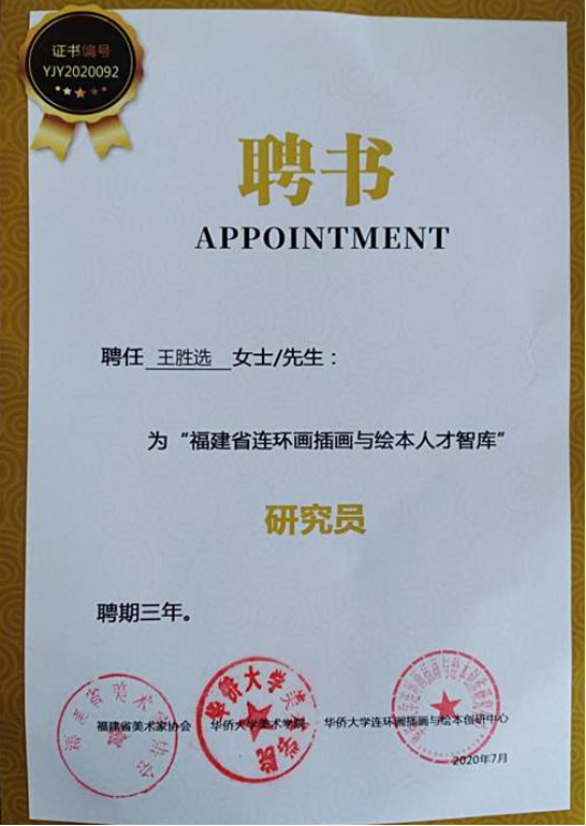 近日,公司王胜选副教授被福建省美术家协会、华侨大学美术公司、华侨大学连环画插画与绘本创研中心聘为“福建省连环画插画与绘本艺术人才智库”研究员,聘期三年。