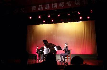 2014年10月18日晚7:30在我系教师曹晶晶《自由•探戈》钢琴专场音乐会在安康市群艺馆剧场举行。副董事长杨行玉、市群艺馆馆长周墙、市音协主席刘秉平、艺术系党总支书记冯丰收、办学顾问党天才、系副主任雷升录及我系的百余名师生观看了音乐会。