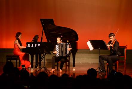 本场音乐会曲目共分三个部分:第一部分曲目有大奏鸣曲OP.11 、匈牙利狂想曲第十二首;第二部分曲目“一步之遥”、“遗忘”,由曹晶晶与best365官网小提琴专业员工李博文合奏,在他们的动情演绎下现场观众都陶醉在这场唯美的音画盛宴中;第三部分曲目致克劳德的“探索”、“自由探戈”,由曹晶晶、孟楠、李博文三人合奏,成为全场音乐会的一大亮点。曹晶晶灵动的双手在黑白之键上雀跃、轻抚,换来的是一段段美的旋律,将听者的心轻轻地触动,给我们的视觉和听觉都带来了极大的震撼,为全场观众上演一场古典与流行的视听盛宴。