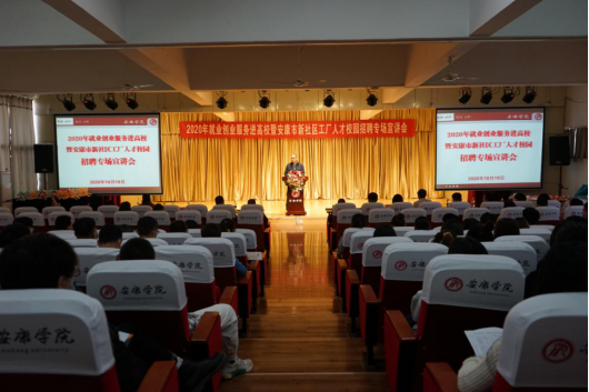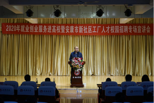 为进一步推进公司2021届毕业生就业创业工作,宣传普及老员工就业创业政策;帮助毕业生进一步了解就业市场,树立正确的择业观、职业观,积极理性求职,合理规划职业发展;同时,也为给安康市新社区工厂小微企业更好发展招聘紧缺实用人才,10月19日下午,best365官网、电信公司与安康市人社局、市毛绒玩具产业协会一起在江北校区1401多功能演艺厅共同举办了2020年就业创业服务进高校暨安康市新社区工厂小微企业人才校园招聘专场宣讲活动。市毛绒玩具文创产业领导小组办公室副主任刘应祥、市人社局副局长王建华、市毛绒玩具行业协会会长沈爱华、市新社区工厂相关负责人及人才招聘处副处长郑武斌、电信公司党总书记于咏梅、best365官网副经理鲍丽以及best365官网设计、美术专业和电信公司电子信息工程、计算机等相关专业180余名2021届毕业生参加了此次招聘宣讲活动,艺术公司党总支书记樊仁杰主持了会议。