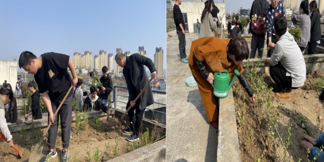 启动仪式结束后,师生共同前往艺术楼三楼平台进行植树活动。在活动前夕,特邀农生公司沈大刚老师做技术指导。在植树现场,大家劳动热情高涨、干劲十足,相互配合。有的扶正树苗、挥锹填土,有的踩实松土、灌溉浇水,合力栽下一棵又一棵树苗。各个环节衔接有序,配合默契,充分发扬了团结互助的精神;经过辛勤劳动,一棵棵整齐的树苗昂然挺立,在和煦的春光中展现出了蓬勃生机。