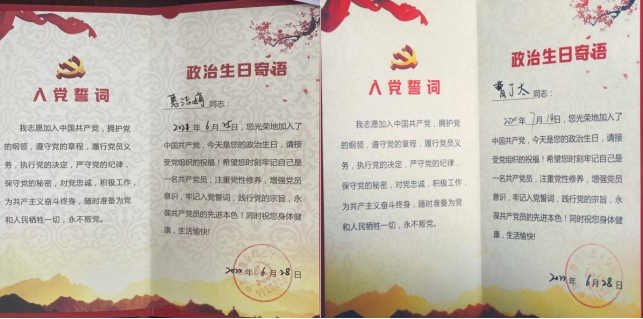 共过一次政治生日·分享一个入党故事。公司员工党支部为全体毕业生党员精心设计了党员政治生日纪念卡。毕业生党员代表曹丁太、惠洁婷分享了入党故事。通过共过政治生日、分享入党故事,使每名员工党员强化身份意识,坚定政治信仰,永葆政治本色。