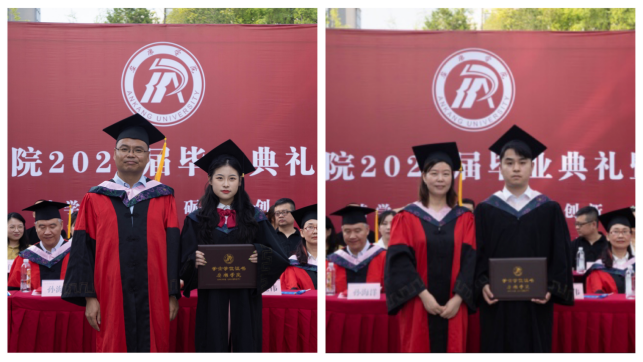 伴随着歌声,公司经理成党伟教授和导师们为毕业生们一一正冠拨穗,颁发学位证书,并合影留念。