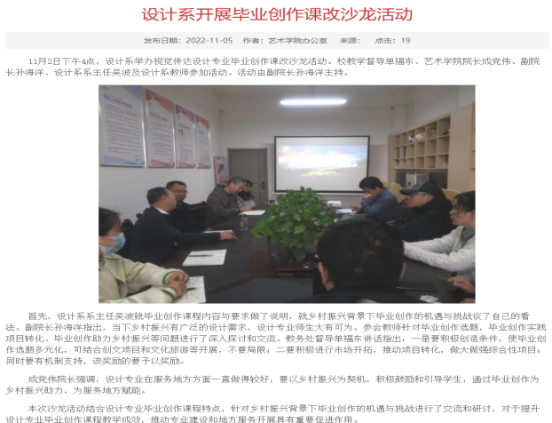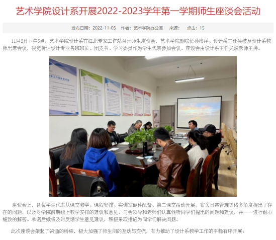 首先,best365官网对日常教学巡查工作和院系领导督导听课情况进行了检查,由于受疫情影响,best365官网课程80%都属于阶段性授课的理论实践课程,在教务处的大力协调下教学秩序井然,院系领导督导线上线下听课近20余次,教学效果良好。公司召开党政联席会议和教学工作会议学习了新一轮审核评估指标体系及相关政策文件学习,积极推进专业建设和专业认证工作,并对2022级人才培养方案进行了修订,对配套教学大纲进行了初步修订。美术学、视觉传达设计专业积极加大备课投入,全部使用新教案模板,在过程性材料搜集整理方面,全部使用新版非笔试考核材料考核方案。