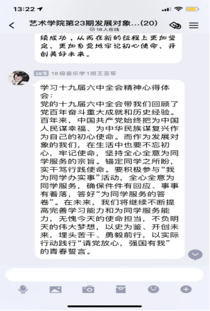 “中国共产党第十九届中央委员会第六次全体会议总结了党百年奋斗的重大成就和历史经验,作为新时代思想政治辅导员,我更应该承担起属于我的责任与使命,坚定理想信念,始终坚持中国共产党的坚强领导,以科学的理论武装自己的头脑,牢记全心全意为人民服务的宗旨,在工作和生活围绕员工、服务员工、关照员工。”