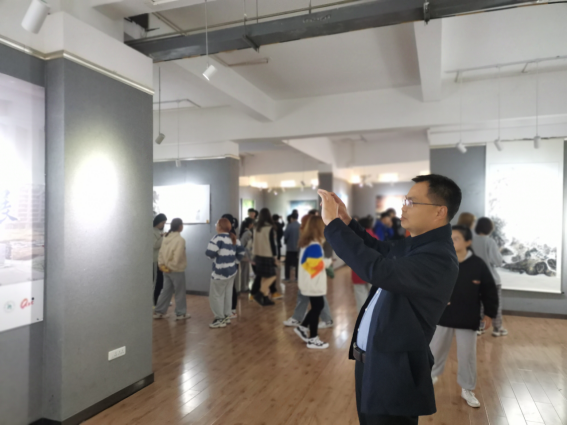活动伊始,李秀春老师介绍了本次艺术文化月活动情况及本次展览的主题。随后,毛德龙老师就中国近现代中国美术史的发展,以及美育时代背景下如何提升自身的审美水平进行了讲解与引导,和同学们一起从前沿开始,了解了历届师哥师姐的创作思想情感和艺术追求。对不同画种的创作,从构图、色彩、技法的变化与思想情感的联系,着重于画面整体布局及情感元素,给同学们进行了解说。他表示:美是纯洁道德、丰富精神的重要源泉,要求同学们要热爱生活,用眼去发现美、欣赏美,用心去感受美、认知美。